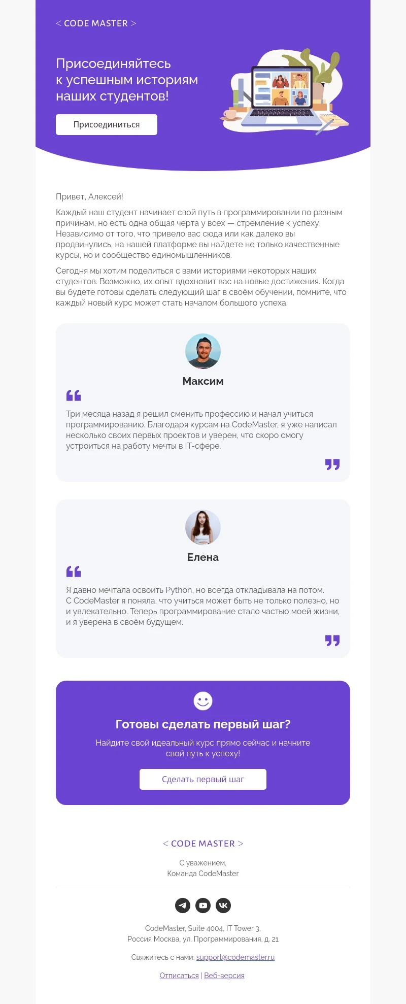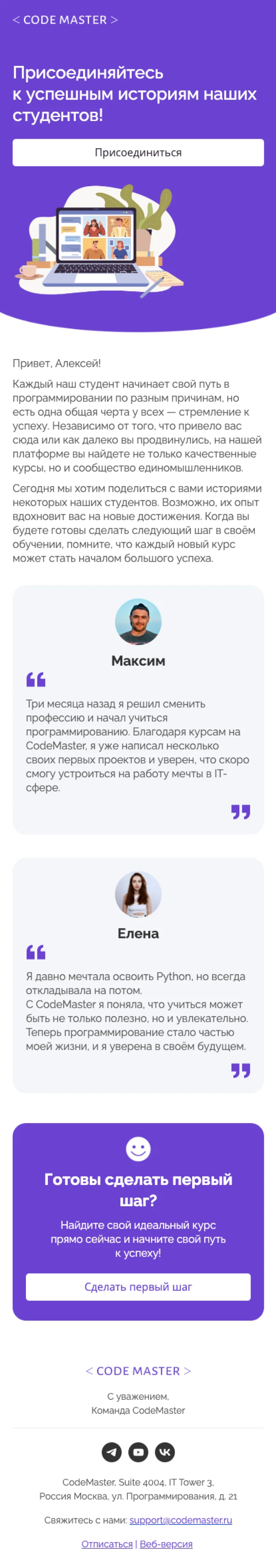 При помощи email-шаблона «Присоединяйтесь к успешным историям наших студентов» вы сможете поделиться реальными кейсами клиентов при помощи рассылки. Расскажите подписчикам, как прошло обучение у других студентов и каких успехов они достигли. Впрочем, использовать шаблон можно и в других сферах — у IT-компаний, рекламных агентств и студий дизайна всегда найдутся довольные клиенты.