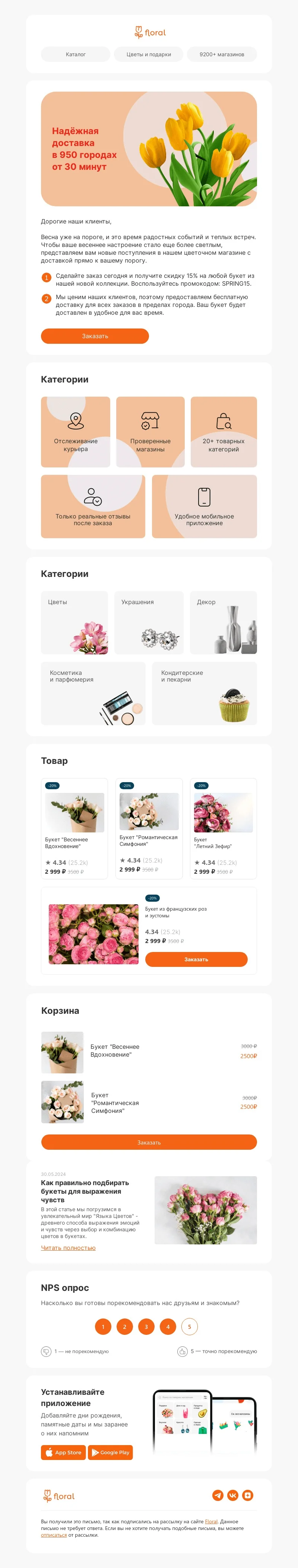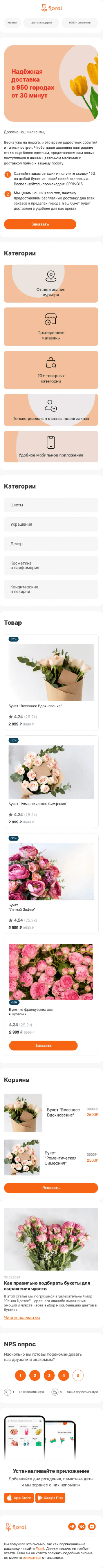 При помощи email-шаблона «Рассылка цветочного магазина» вы сможете отправлять красивые письма своим клиентам — подписчиками студий флористики, цветочных мастерских, магазинов растений и подарков. В макете использована мягкая цветовая палитра персиковых оттенков. Но её можно менять в зависимости от инфоповода, сезона или ассортимента, о котором вы рассказываете в рассылке.