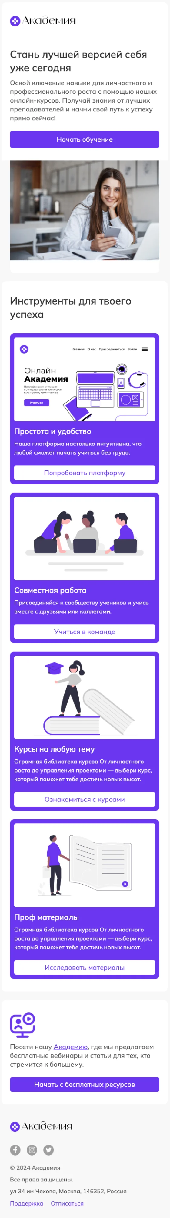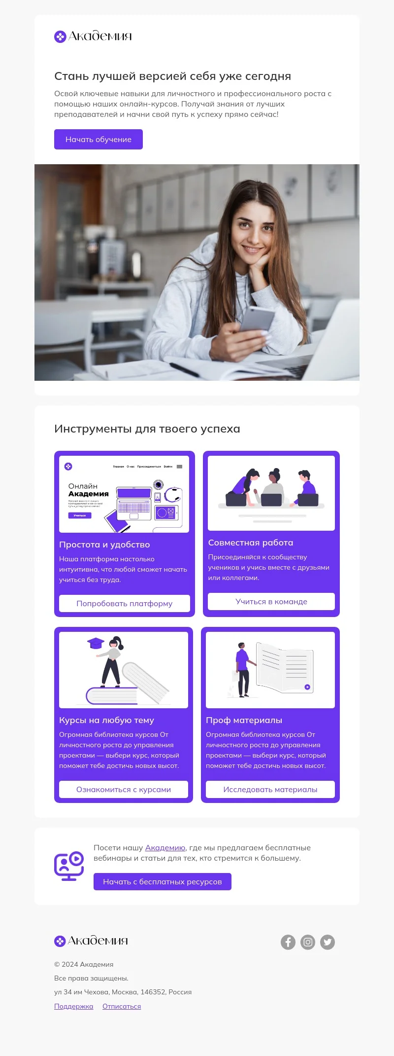 При помощи email-шаблона «Развивай себя с помощью курсов от экспертов» вы сможете создать рассылку для подписчиков онлайн-школ и других компаний и персон в сфере EdTech. Расскажите, как проходит обучение, какие выгоды получают студенты, почему учиться у вас — удобно и приятно. В макете найдётся место для презентации спикеров и преподавателей, которые ведут уроки и проверяют практику.