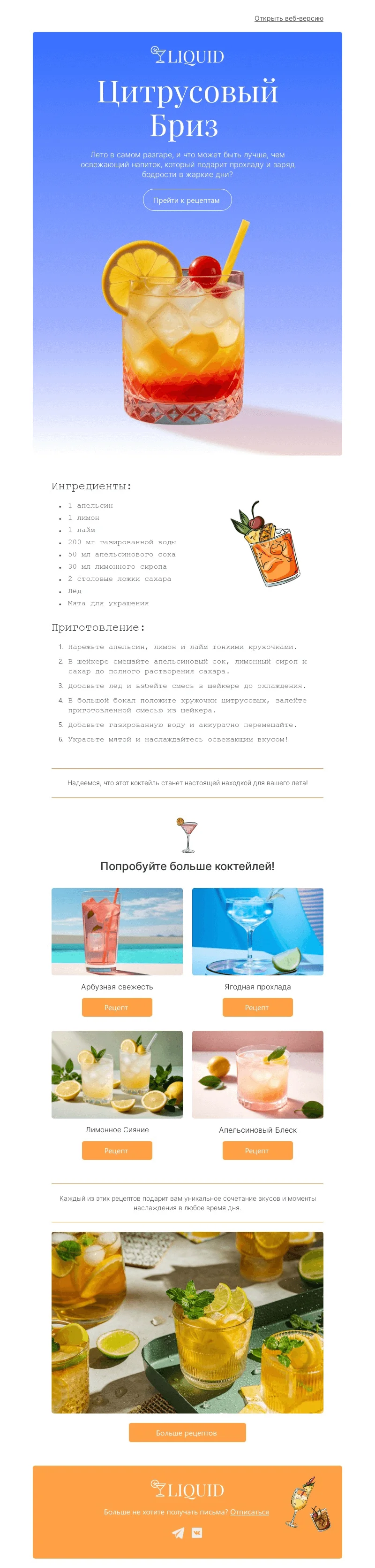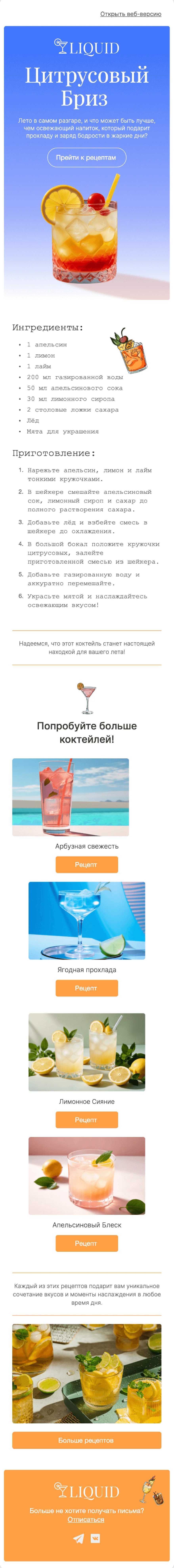 При помощи email-шаблона «Рецепты освежающих напитков» вы сможете ярко и красиво рассказать о фирменных рецептах от бармена и поделиться коктейльными и кулинарными традициями разных кухонь. Этот макет пригодится всем, кто знает толк во вкусном: ресторанам, кафе, пекарням, барам, а также медиа, которые пишут о еде. Подставляйте в шаблон свой контент и отправляйте стильные промо- и информационные рассылки подписчикам.