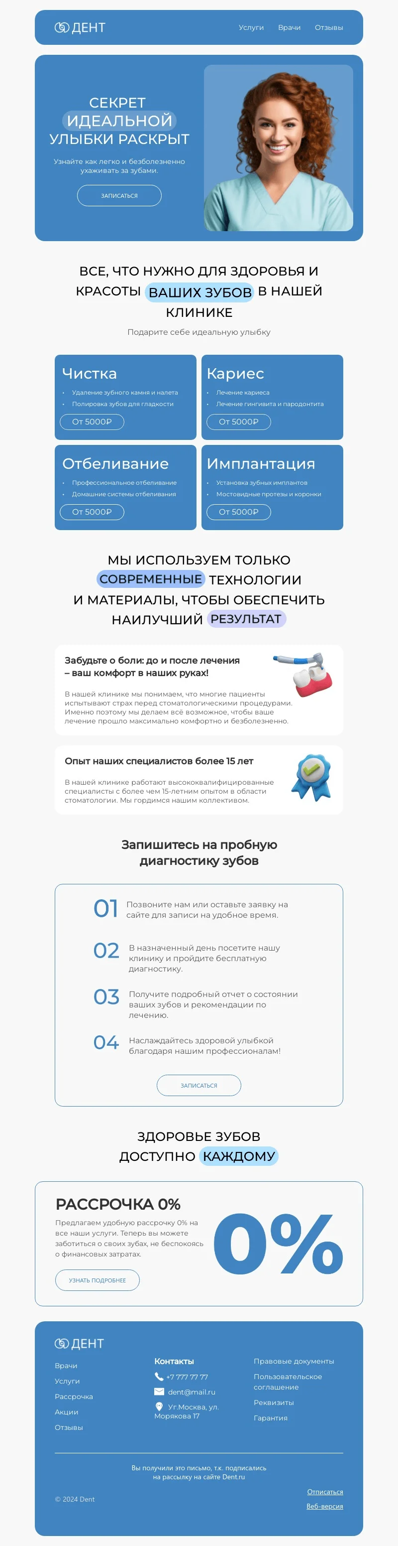 Email-шаблон «Секрет идеальной улыбки раскрыт» предназначен для стоматологий, центров имплантации и эстетической медицины зубов. Этот макет можно использовать для презентации услуг клиники и самых популярных услуг, а также для анонса акций и спецпредложений. Расскажите клиентам, чем может помочь команда ваших врачей, поделитесь полезным контентом и с помощью рассылки пригласите воспользоваться услугами стоматологии.