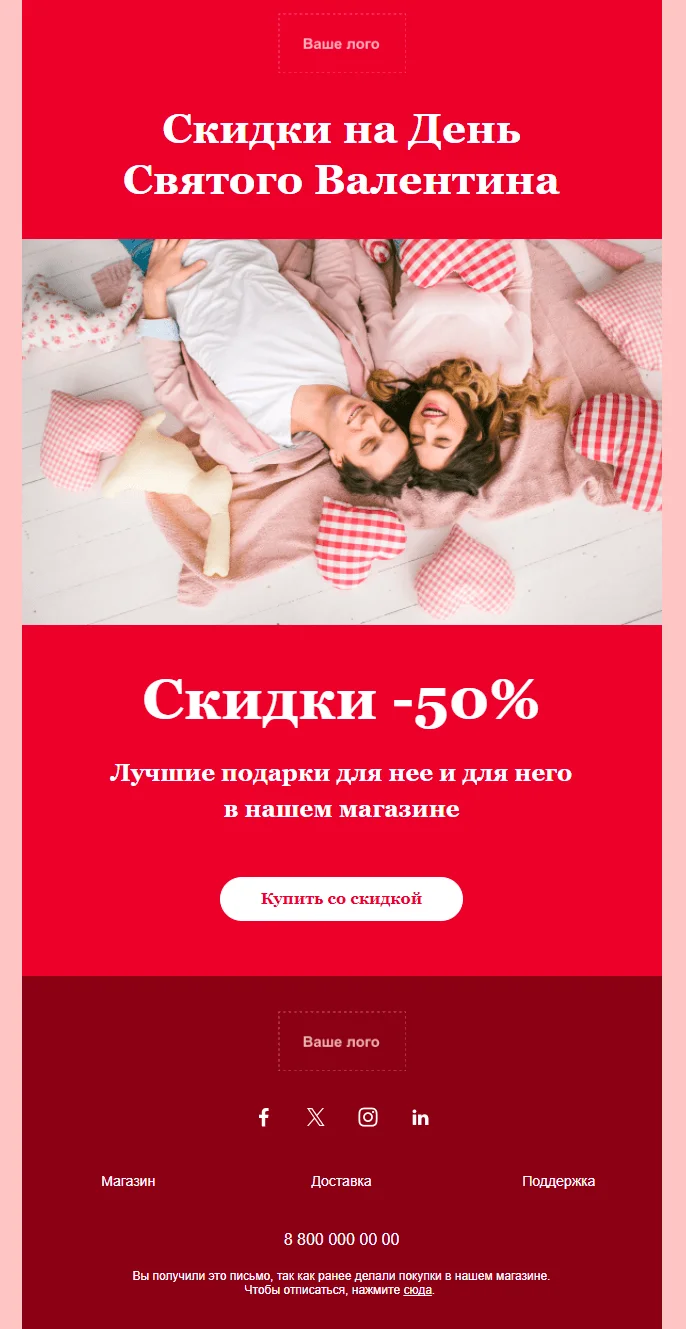 Email-шаблон «Скидки на День святого Валентина» поможет отправить праздничную рассылку к 14 февраля. Вашему интернет-магазину есть что предложить в качестве подарка? Напишите об этом подписчикам и дайте ссылку на подборку идей товаров, которые станут отличным презентом ко Дню всех влюблённых.