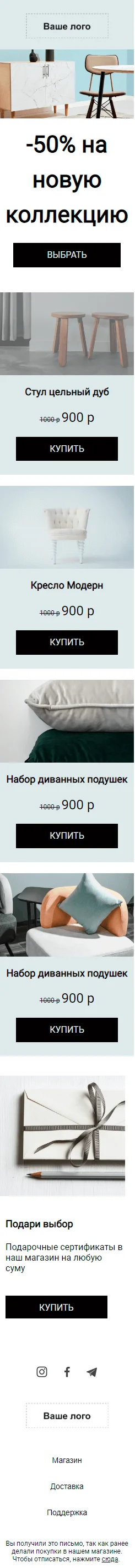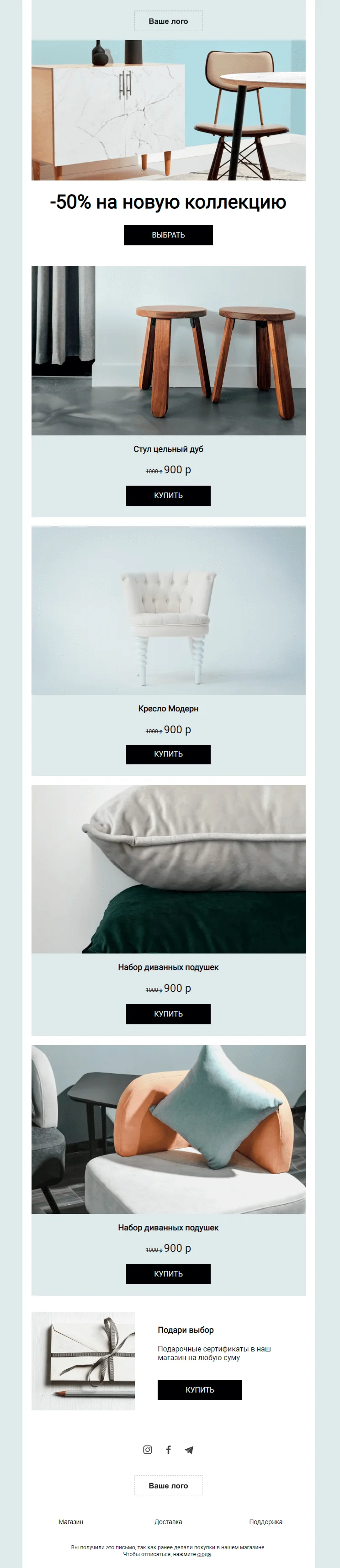 Используйте шаблон «Скидки на новую коллекцию» и расскажите покупателям про дисконт на новинки в вашем интернет-магазине. Чтобы создать красивую email-рассылку, просто подставьте фотографии в готовый шаблон письма, добавьте свой текст и контакты — и можно отправлять. Вы можете редактировать, удалять и добавлять любые блоки, чтобы создать идеальное письмо для ваших клиентов.