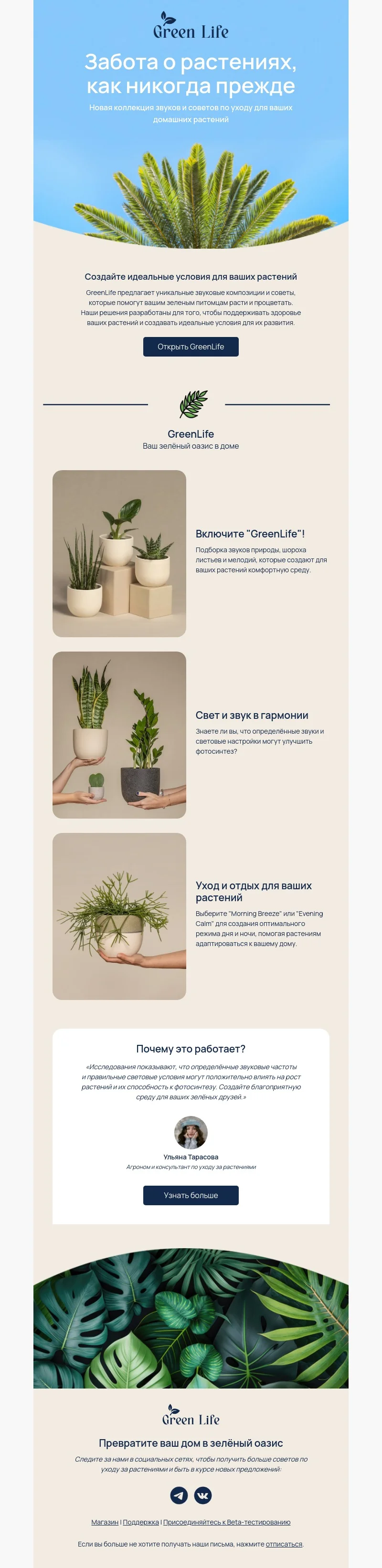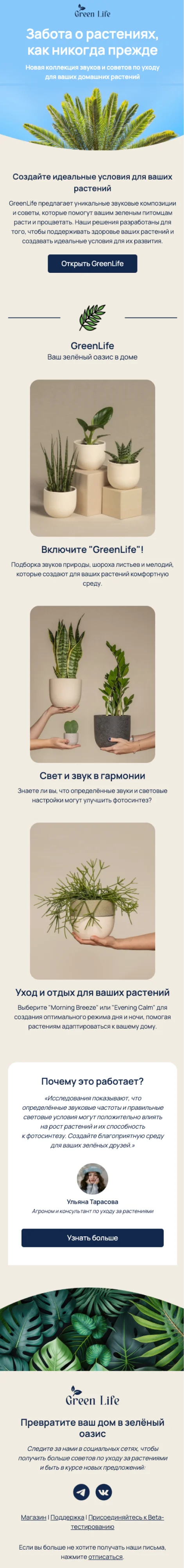 Email-шаблон «Советы по уходу для ваших домашних растений» создан специально для цветочных интернет-магазинов, питомников растений, гипермаркетов садовых товаров, а также для тематических медиа. С помощью этого макета вы сможете создать красивую рассылку с советами по выращиванию растений, уходу за цветами. Просто подставьте в шаблон свой текст и иллюстрации — и делитесь с подписчиками полезным контентом.