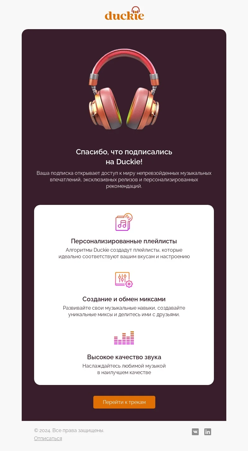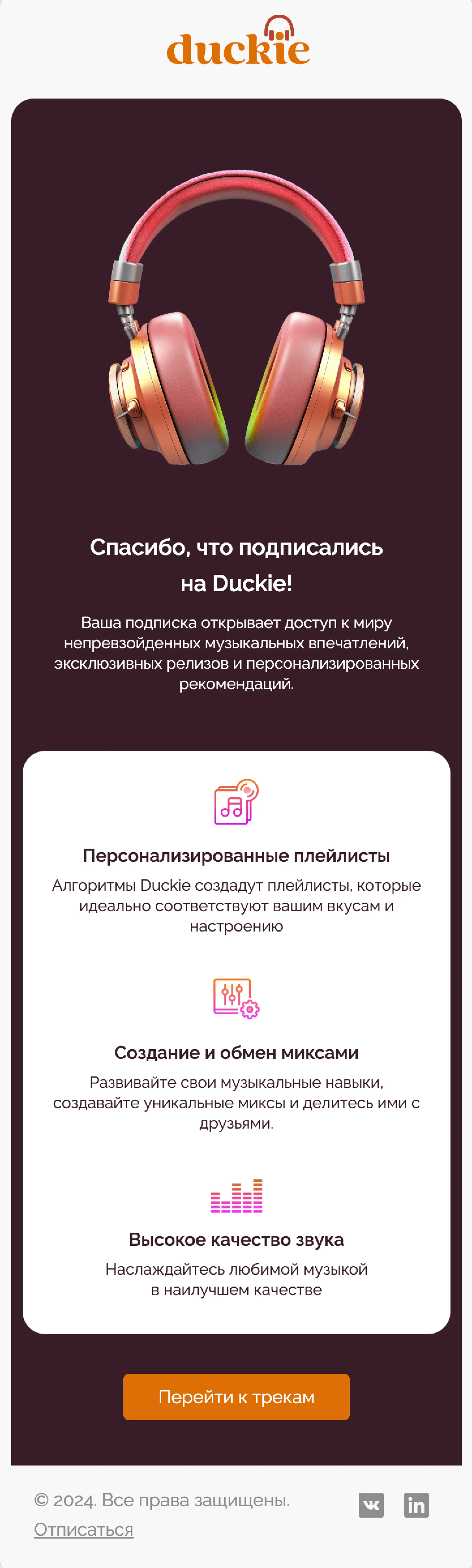 При помощи email-шаблона «Спасибо за подписку!» вы лаконично, но полезно поблагодарите новых пользователей сервиса, сайта или приложения. Не забудьте добавить описания преимущества и выгоды, которые теперь доступны подписчику: например, бонусные баллы, приоритетный доступ к новинкам платформы, персональные ИИ-рекомендации или что-то ещё.