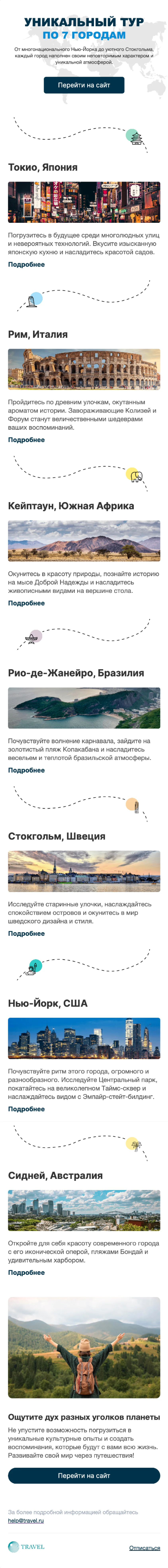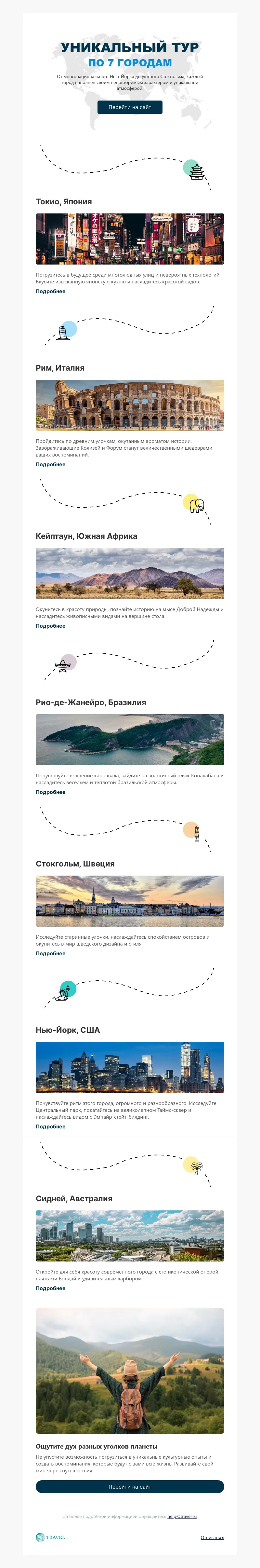 Шаблон email-рассылки «Тур по городам» точно пригодится тем, кто организует авторские путешествия, помогает туристам с трансферами в путешествии и любым компаниям, которые бизнес в турсфере. В этот макет со стильными дизайнерскими элементами вы можете подставить контент про любые города и уникальные места, рассказать о маршруте тура, поделиться полезной информацией, которая пригодится вашим клиентам в путешествии.