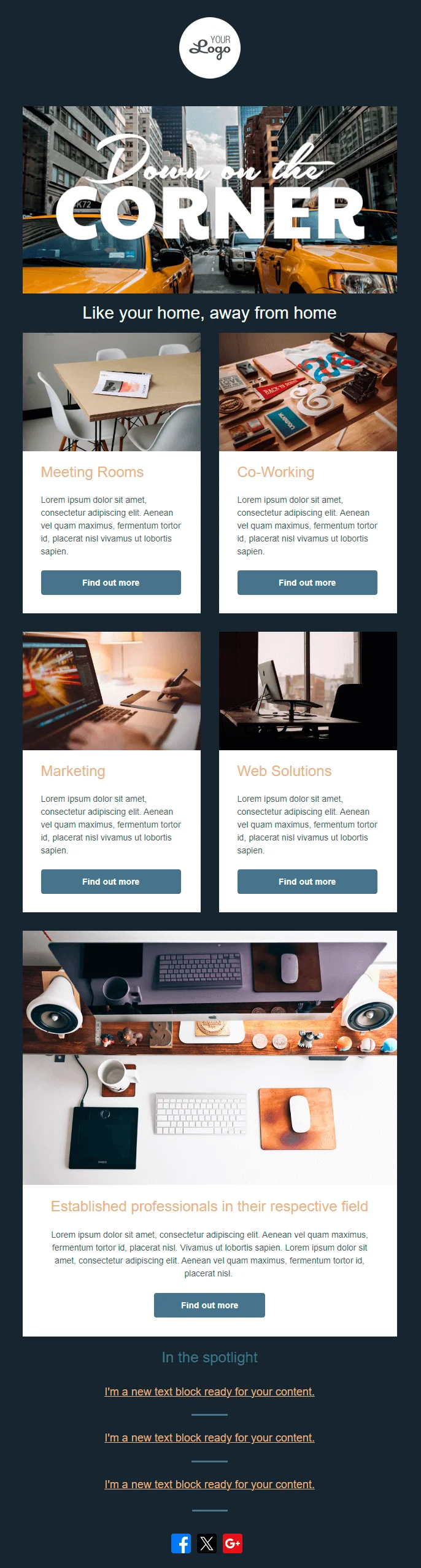 Email-шаблон «Услуги коворкинга» пригодится владельцам коммерческих помещений и девелоперским компаниям, которые предлагают офисы в аренду — для бизнеса и отдельных специалистов. Используйте email-рассылку для презентации своих помещений и услуг, которые оказываете в B2B- и B2C-сегментах. Не забудьте добавить актуальные фото, адреса и привлекательные описания объектов.