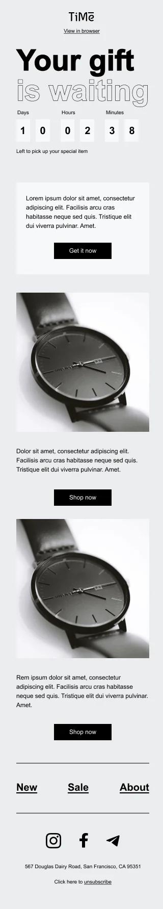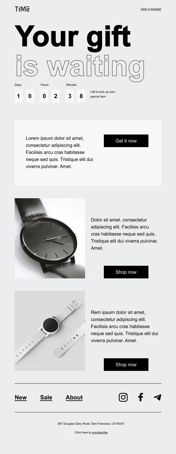 Шаблон «Ваш подарок ждёт» поможет быстро создать email-рассылку о начале акции. В письме — таймер обратного отсчёта и два блока для презентации товаров. Наполните шаблон своим контентом, при необходимости отредактируйте внешний вид: цвета блока и фона, внешний вид кнопок, шрифт. Добавьте недостающие блоки, чтобы показать больше товаров или дать дополнительную информацию об акции.