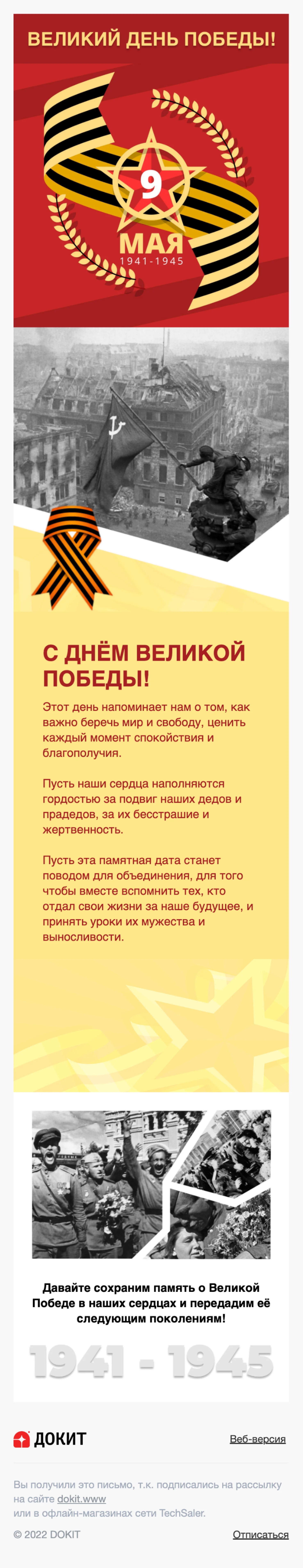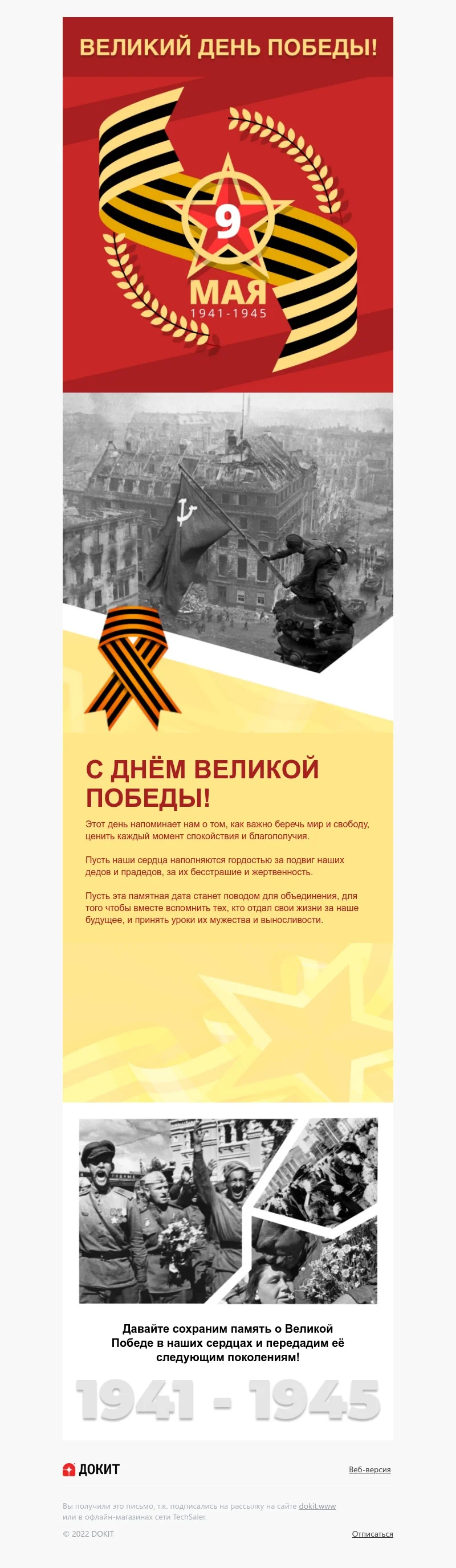 При помощи email-шаблона «Великий День Победы!» вы легко поздравите своих подписчиков с 9 Мая красивым письмом. Этот шаблон подойдёт для рассылки в любой нише — e-commerce, образовательной сфера, НКО, туризме и любой другой. В макете использована традиционная и очень узнаваемая стилистика Дня Победы, в качестве иллюстраций также добавлены чёрно-белые ретро фотографии.