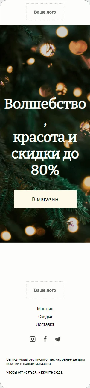 Email-шаблон «Волшебство, красота и скидки» — для тех, кто ценит краткость. Не хотите распылять внимание подписчиков? Мечтаете выделиться на фоне однообразных писем с плиточкой товаров? Просто отправьте email-рассылку на основе этого шаблона: красивая картинка, оффер и кнопка с переходом в каталог. Главное, позаботьтесь, чтобы пользователи нашли действительно стоящие предложения и подарки на новогодних страницах вашего сайта.