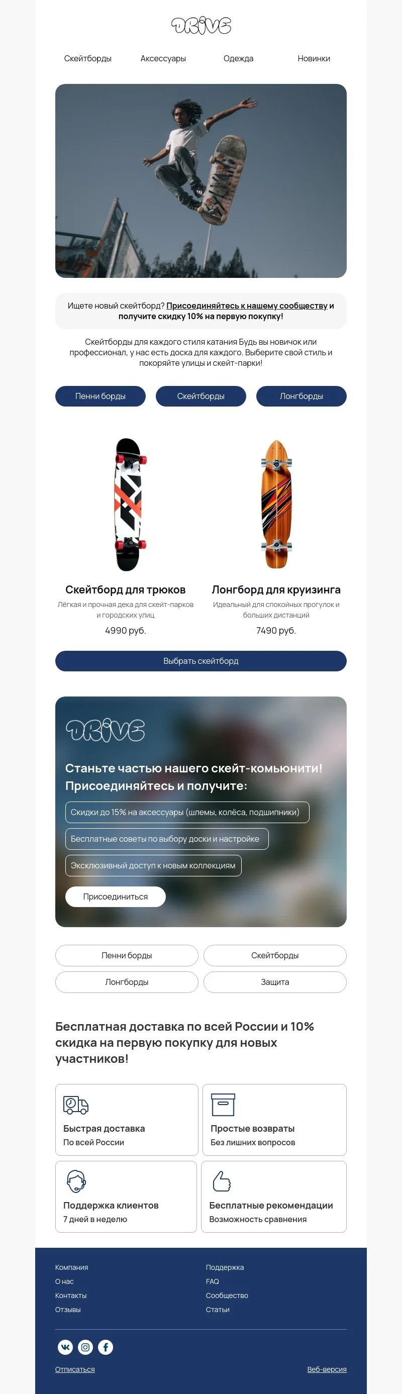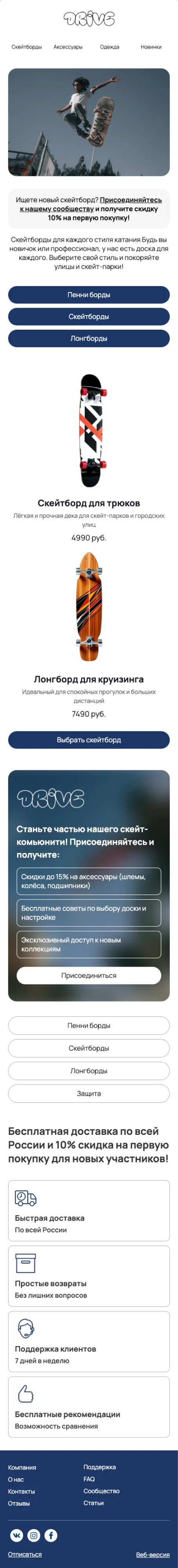 С email-шаблоном «Выберите свой идеальный скейтборд» можно легко и быстро собрать рассылку для клиентов магазина спортивных товаров. В макете уже есть классные и динамичные фото — вы можете оставить их в письме или заменить на фотографии товаров из вашего каталога. Не забудьте добавить пару полезных советов по выбору и призыв к покупке.