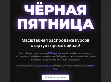 - анонс — информация о том, что приближается Чёрная пятница и что покупателей ждут большие скидки и специальные предложения;