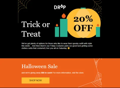 Несмотря на неоднозначное отношение к празднику, email-рассылки к Хэллоуину отправляют довольно часто. Причём это могут быть абсолютно разные бизнесы: магазины костюмов и аксессуаров, организаторы мероприятий, производители товаров для декора, кафе и рестораны, предлагающие специальное меню на этот день, а также издательства, выпускающие книги, комиксы и фильмы на тему Хэллоуина.