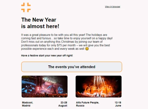 Отправку новогодних email-рассылок стоит начинать заранее — за месяц-полтора, когда аудитория уже готовится к празднику, ищет подарки и планирует зимний отдых. Хорошо, если получится совместить продающие письма с полезным контентом. Вот что можно писать в новогодних письмах.