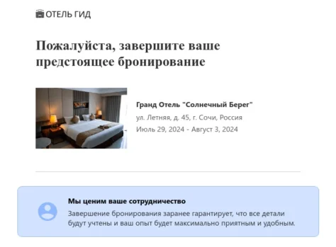 Помимо писем, которые касаются непосредственно проживания в отеле или апартаментах, гостиницы также могут отправлять контентные email-рассылки. В них можно рассказывать о достопримечательностях, маршрутах, транспорте в месте путешествий, делиться с туристами другой полезной информацией. Это не только позволяет выстроить доверительные отношения с аудиторией, но и помогает вторично привлечь в отель путешественников, которые уже приезжали и остались довольны сервисом.