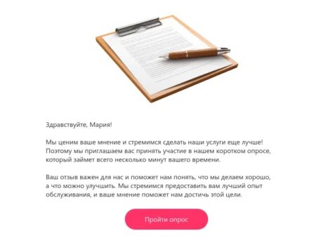 - текст письма — с объяснением, почему и о чём хотите узнать мнение клиента;
