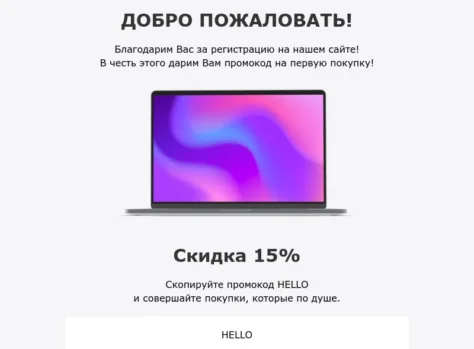 Если пользователь оставил свой контакт, отправьте ему email-рассылку с предложением скачать подарок. Помимо ценного контента это также может быть промокод на скидку или ссылка для регистрации в программе лояльности с подарочными баллами на балансе.
