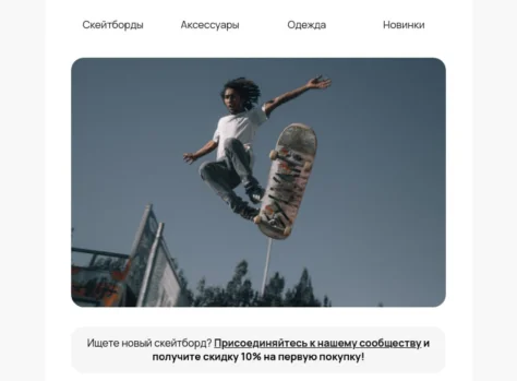 - тексты и изображения — в проморассылке это могут быть названия и описания товаров с кнопкой перехода в магазин, в контентных письмах — подводки к статьям или дайджест спортивных событий;
