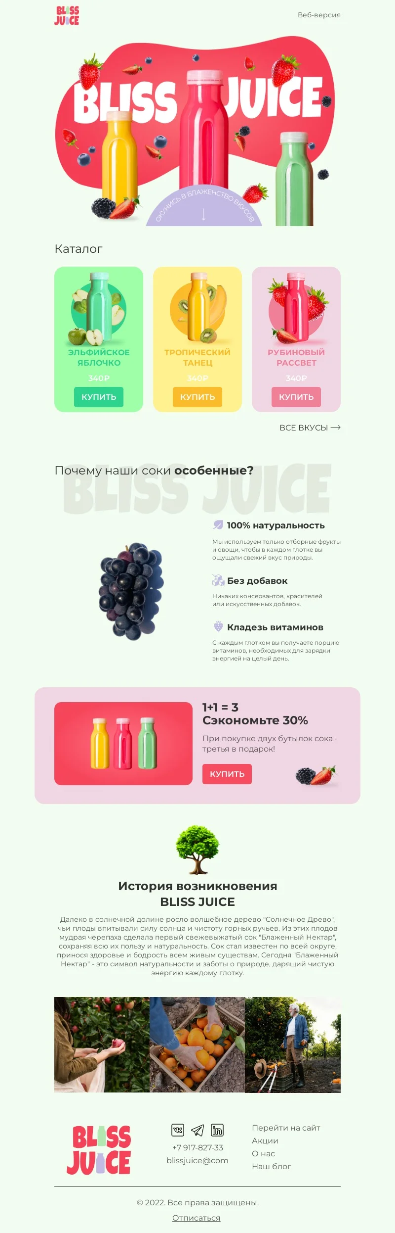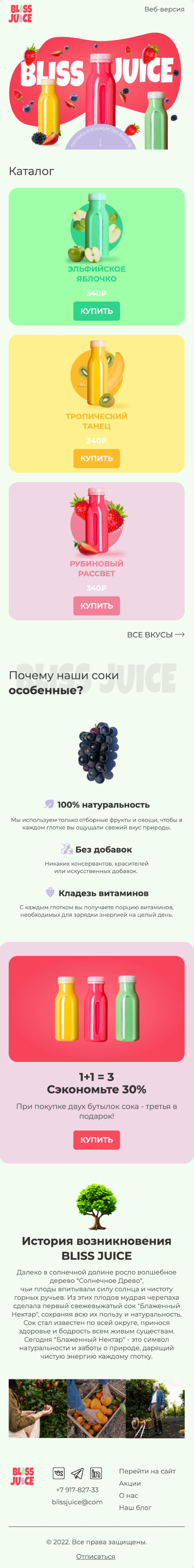 Сочная палитра email-шаблона «Широкий выбор натуральных соков» идеально подходит тем, кто торопится рассказать клиентам о новинках в ассортименте: соки, фрукты, ягоды, натуральные десерты и другие по-настоящему летние товары прекрасно впишутся в этот макет. Не забудьте добавить информативные описания товаров, чтобы покупатели были уверены в своём выборе, и привлекательно рассказать о бренде — для этого есть отдельный блок внутри письма.